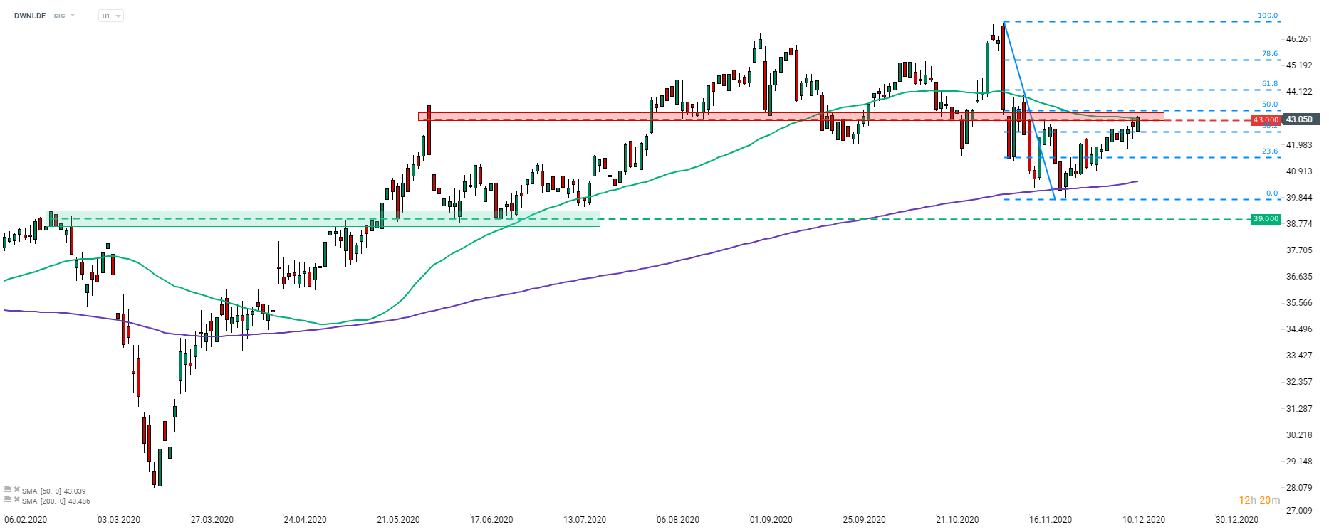 Deutsche Wohnen (DWNI.DE) se podařilo ukončit krátkodobý klesající trend z listopadu. Akcie se odrazily od úrovně 200 denního klouzavého průměru (fialová čára). Cena akcie vzrostla a vytvořila lokální maximum. Nyní testuje zónu rezistence mezi úrovní €43 a 50 % retracementem, který je navíc posílen 500 denním klouzavým průměrem (zelená čára). Zdroj: xStation5