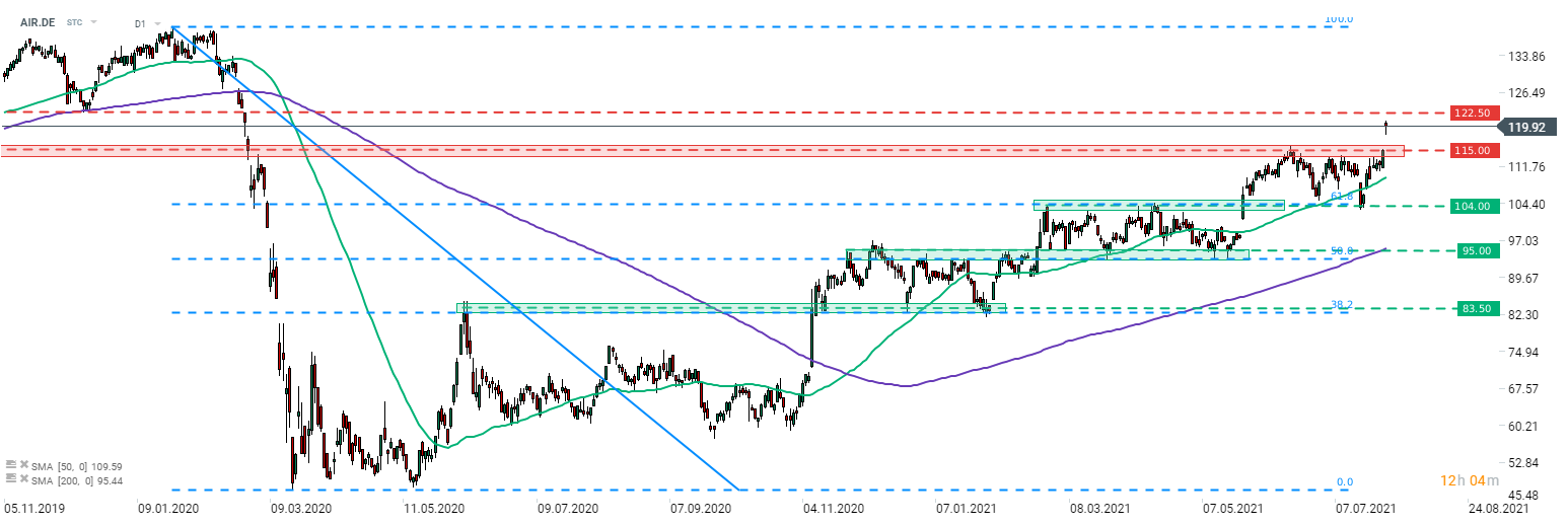 Akcie spoločnosti Airbus (AIR.DE) zaznamenali nárast. Akcie začali obchodovanie nad hornou hranicou nedávneho obchodného rozsahu a akcia sa obchoduje na nových post-pandemických maximách. Krátkodobý odpor je na úrovni 122,50 EUR, ale potenciálny únik z obchodného rozpätia ukazuje na pohyb smerom nahor až k oblasti 126,50 EUR. Zdroj: xStation5