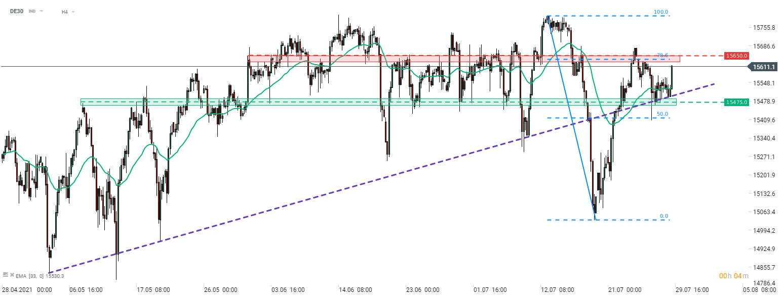 DE30 ťaží po zasadaní FOMC zo zlepšenia sentimentu k rizikovým aktívam. Nemecký index sa odrazil od zóny podpory, ktorá sa nachádza na hladine 15 475 bodov, kde sa nachádza stúpajúca trendová čiara. Index sa môže stať volatilnejším v skorých popoludňajších hodinách po zverejnení správy o HDP z USA v druhom štvrťroku 2021 o 14:30.