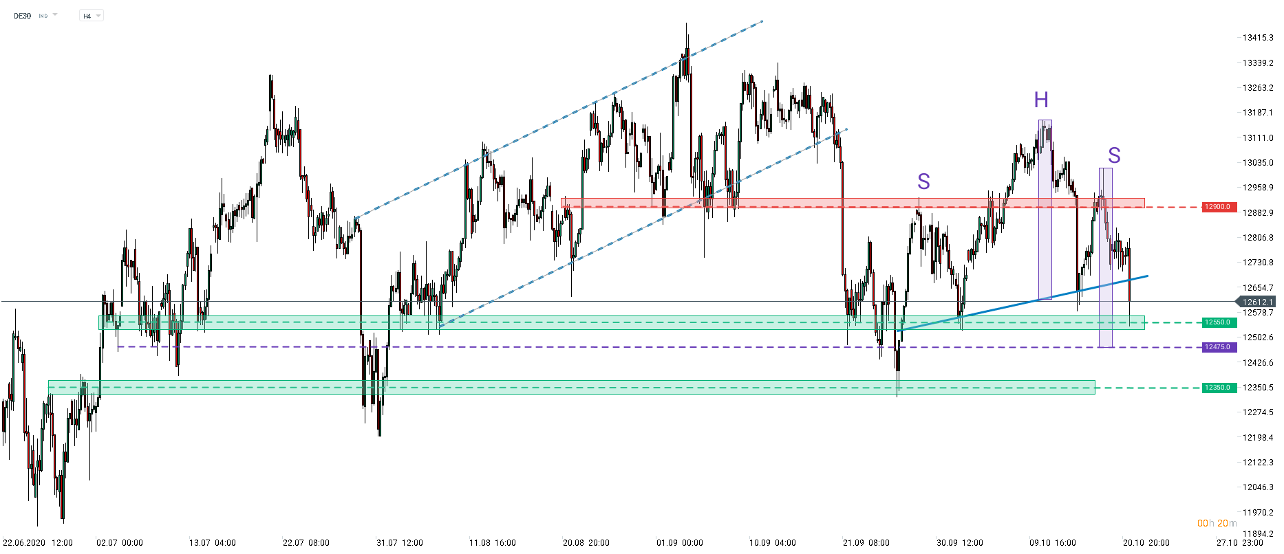 DE30 sa dne dostal pod výstrih hlavy a ramien. Teoreticky môže cena klesnúť až k úrovni 12 475 bodov, ale zatiaľ boli poklesy zastavené blízko mesačného minima na úrovni 12 550 bodov. Nemecký index zaznamenal v aktuálnej zostupnej sekvencii nižšie minimum. V prípade, že cena klesne pod hladinu 12 550 bodov, pozornosť sa presunie na podporu vo výške 12 350 bodov. Na druhej strane, ak by sa indexy zotavili, prvá veľká rezistencia sa nachádza v oblasti 12 900 bodov.