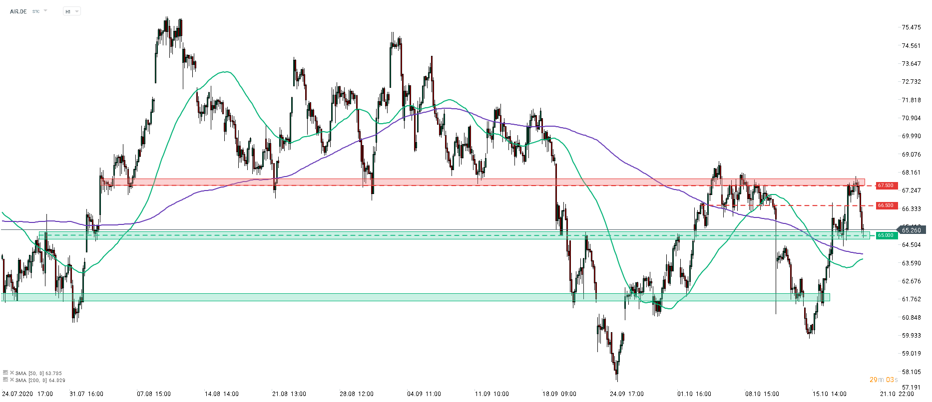 Akcie spoločnosti Airbus (AIR.DE) dnes zaznamenali pokles. Cena sa odrazila od zóny odporu na úrovni 67,50 EUR a dosiahla podporu na hladine 65 EUR. Býci sa tam snažia zastaviť poklesy, ale ak zlyhajú, nemožno vylúčiť test 200-hodinového kĺzavého priemeru (fialová čiara, 64 €). Zdroj: xStation5