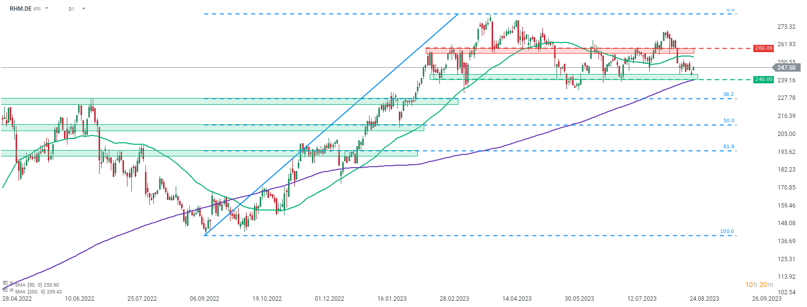 Rheinmetall (RHM.US) se dnes obchoduje výše a odráží se od oblasti podpory 240 EUR. Akcie v poslední době uvízly převážně v bočním pohybu a k tomu, aby se objevil výraznější býčí signál, by bylo zapotřebí překonat zónu odporu 260 EUR. Zdroj: xStation5