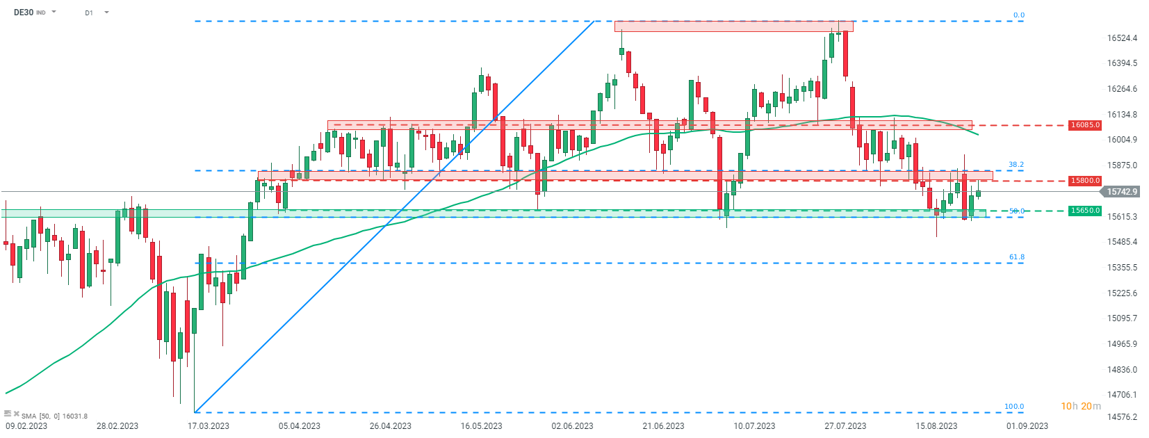 Německý DAX zahájil dnešní obchodování růstem a za celý den si připsal přibližně 0,5 %. Při pohledu na graf futures na DAX (DE30) v intervalu D1 vidíme, že část dnešních zisků již byla vymazána, přičemž býci testovali hranici 15 800 bodů, ale nepodařilo se jim ji překonat. Zdá se, že zóna mezi 15 800 body a 38,2% retracementem se ukazuje jako krátkodobá rezistence, kterou je třeba sledovat, a potenciálně horní hranice nového obchodního rozpětí. Směrem dolů by toto rozpětí omezovala zóna pohybující se mezi úrovní 50 % retracementu a hranicí 15 650 bodů, která v poslední době již dvakrát zastavila pokles.