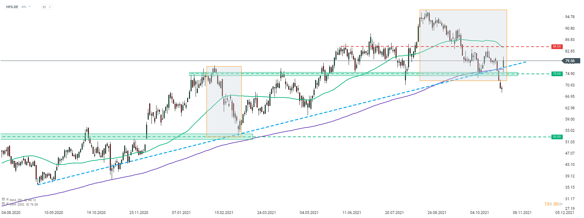 Akcie HelloFresh (HFG.DE) dnes prudce rostou v reakci na zlepšení celoročního výhledu. Akcie přidává až o 14 % a podařilo se jí prorazit několik důležitých technických úrovní - spodní limitu tržní geometrie, cenovou zónu v blízkosti €75 a rostoucí trendovou čáru. Další rezistence leží na úrovni €84,50. Tam se nachází 50 období klouzavý průměr (zelená čára). Zdroj: xStation5