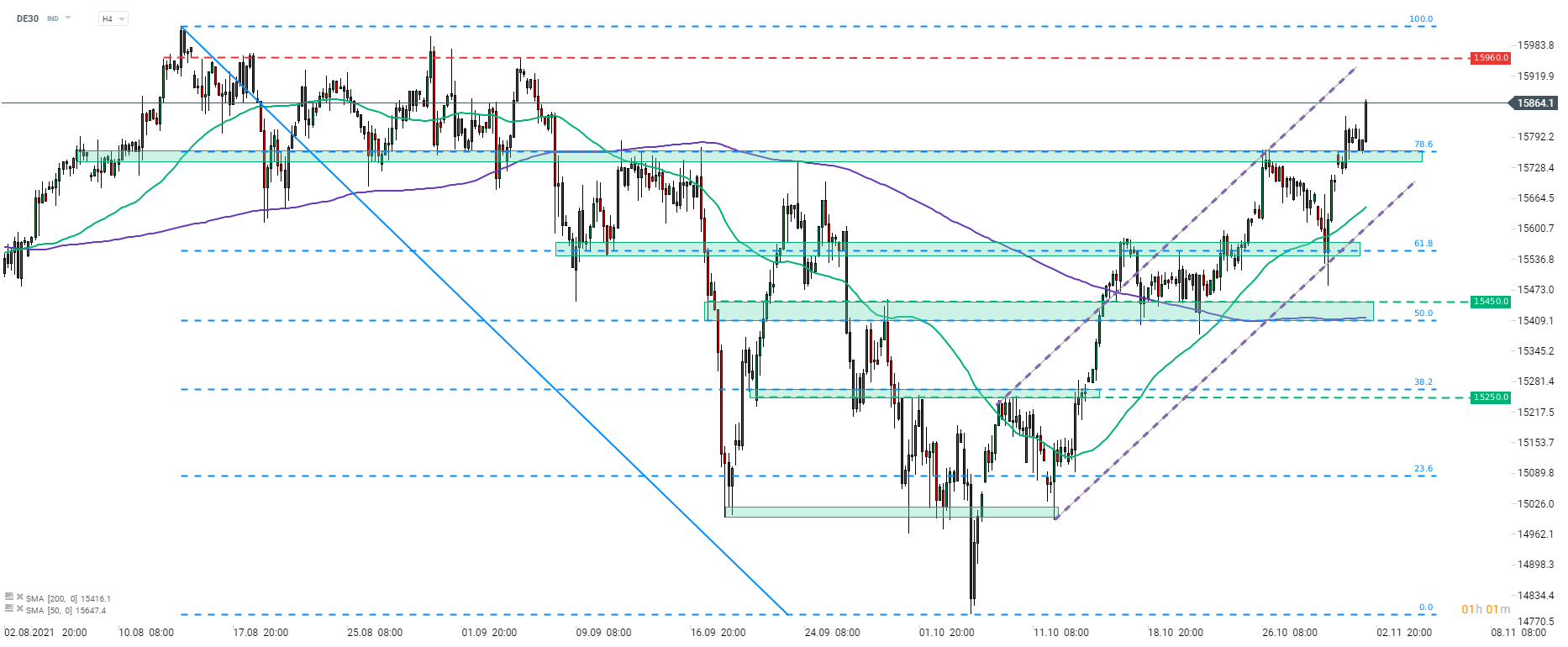 DE30 index pokračuje v reakci na Fibo retracement s počátkem v srpnu 2021. Index se v minulém týdnu odrazil od úrovně 61,8 % retracementu a vystoupal nad 78,6 % retracementu na počátku týdne. Po opětovném otestování této úrovně dnes ráno index navázal na zisky a dostal se až nad 15 850 bodů. Dosáhl tak na nejvyšší úrovně od 7. září 2021. Index se pohybuje v prudkém rostoucím kanálu a další úroveň rezistence se nachází v blízkosti horní limity oblasti 15 960 bodů. Tato zóna je definována lokálními maximy ze srpna a je umístěna mírně pod historickými maximy. Velkou událostí je zítřejší zasedání FOMC, na kterém se čeká omezení nákupu dluhopisů.