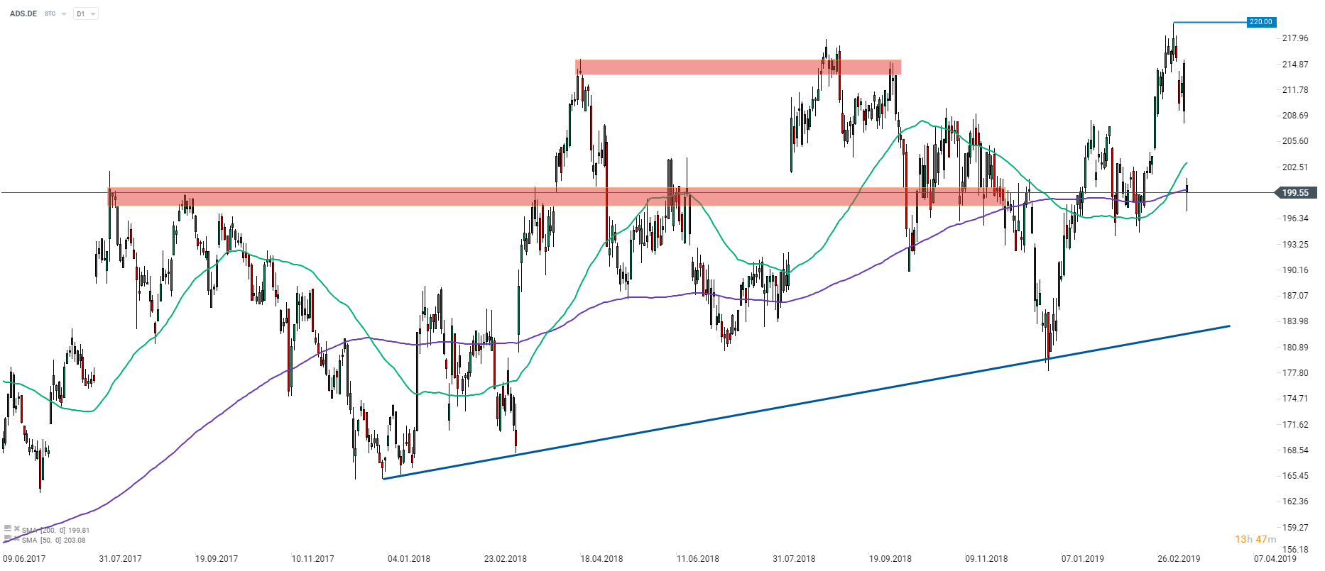 Cena akcií spoločnosti Adidas (ADS.DE), dosiahla minulý týždeň najvyššiu hodnotu v histórií na úrovni 220 eur, čo je v súčasnosti pre európske spoločnosti dosť nezvyčajné. Akcie sa však vplyvom negatívnych správ dostali pod tlak, čím zaznamenali pokles o 5% k 200-dňovému kĺzavému priemeru. Zdroj: xStation5