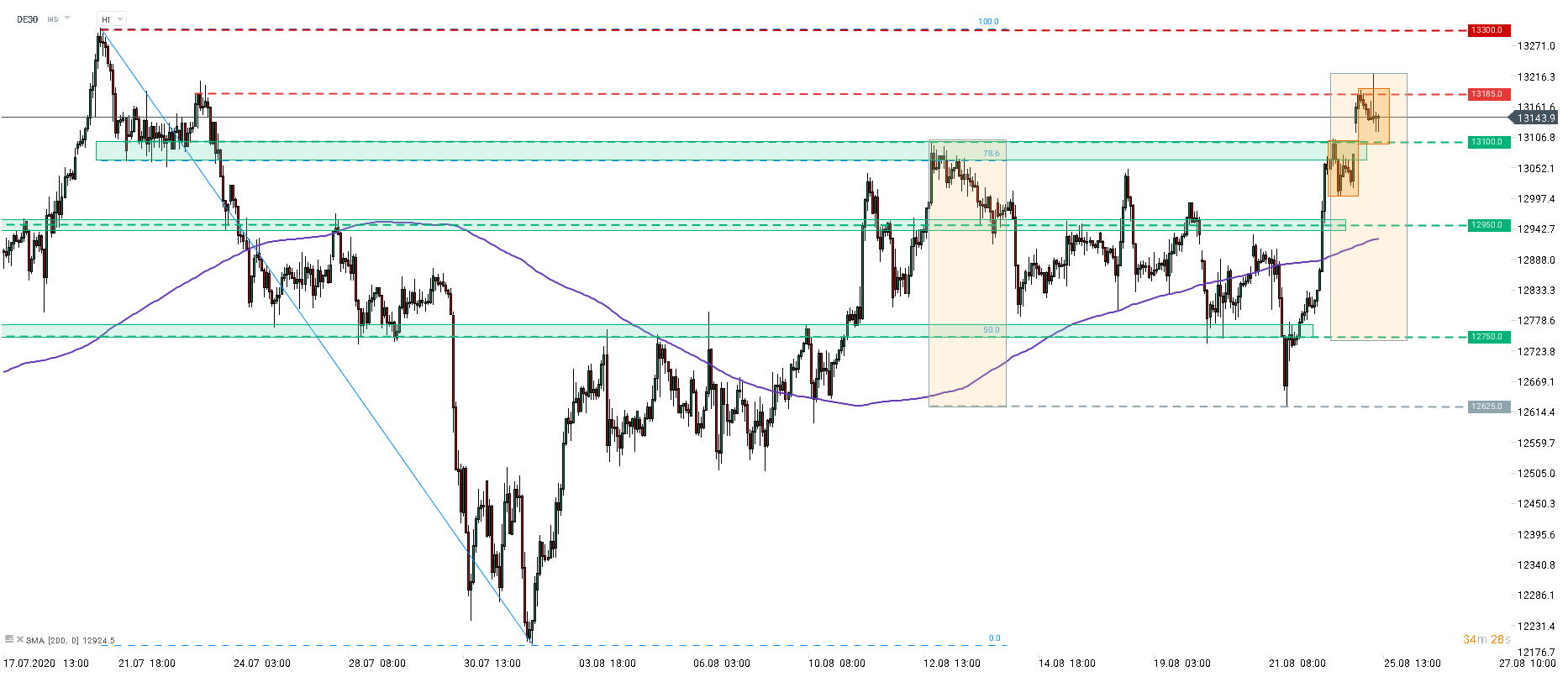 DE30 prorazil nad zónu rezistence mezi 78,6 % Fibo retracementem korekce z konce července a úrovní 13 100 bodů. Německý index následně otestoval lokální maximum z 23. července na 13 185 bodech, nicméně nad tuto úroveň se mu dostat nepodařilo a následně přišla korekce. Vidíme krátkodobý support definovaný tržní geometrií (oranžové obdélníky) na hladině 13 100 bodů. Pokles indexu zpomalil po začátku evropské seance, takže obchodníci by se měli soustředit na hledání býčích svíčkových formací. Na úrovních 13 185 a 13 300 bodů vidíme nejbližší hladiny rezistence. Klíčový support definovaný velkou strukturou Overbalance je k vidění na hladině 12 750 bodů.