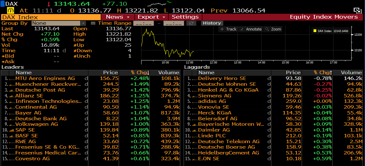 Akcie s pozitivním obchodní korelací - Infineon Technologies (IFX.DE), MTU Aero Engines a Continental (CON.DE) - dnes vedou index DAX na vyšší úrovně. Zdroj: Bloomberg