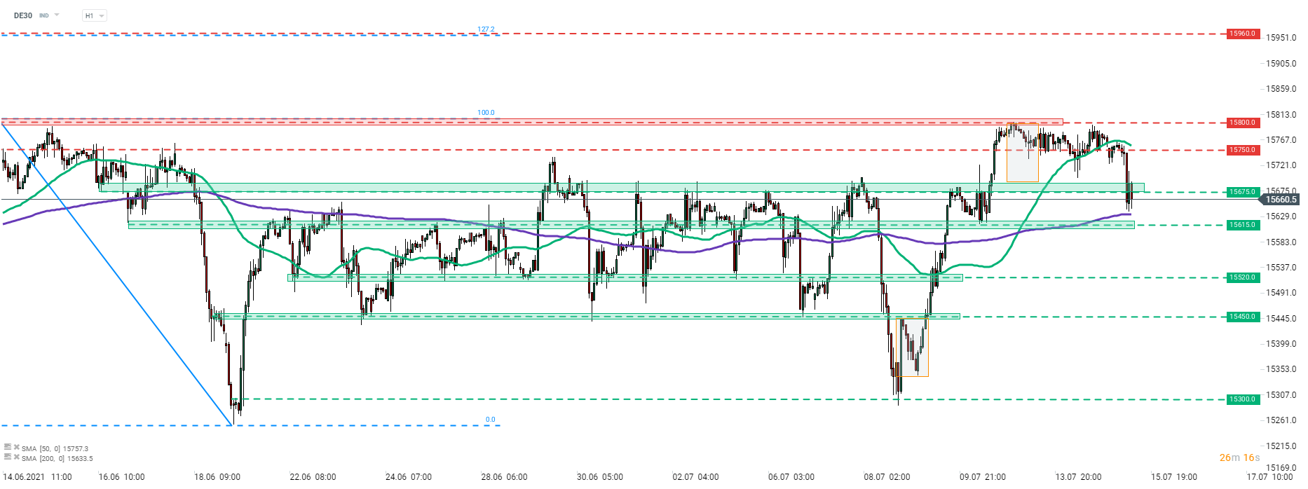 DE30 klesl pod spodní limitu tržní geometrie a testuje 200 hodinový klouzavý průměr