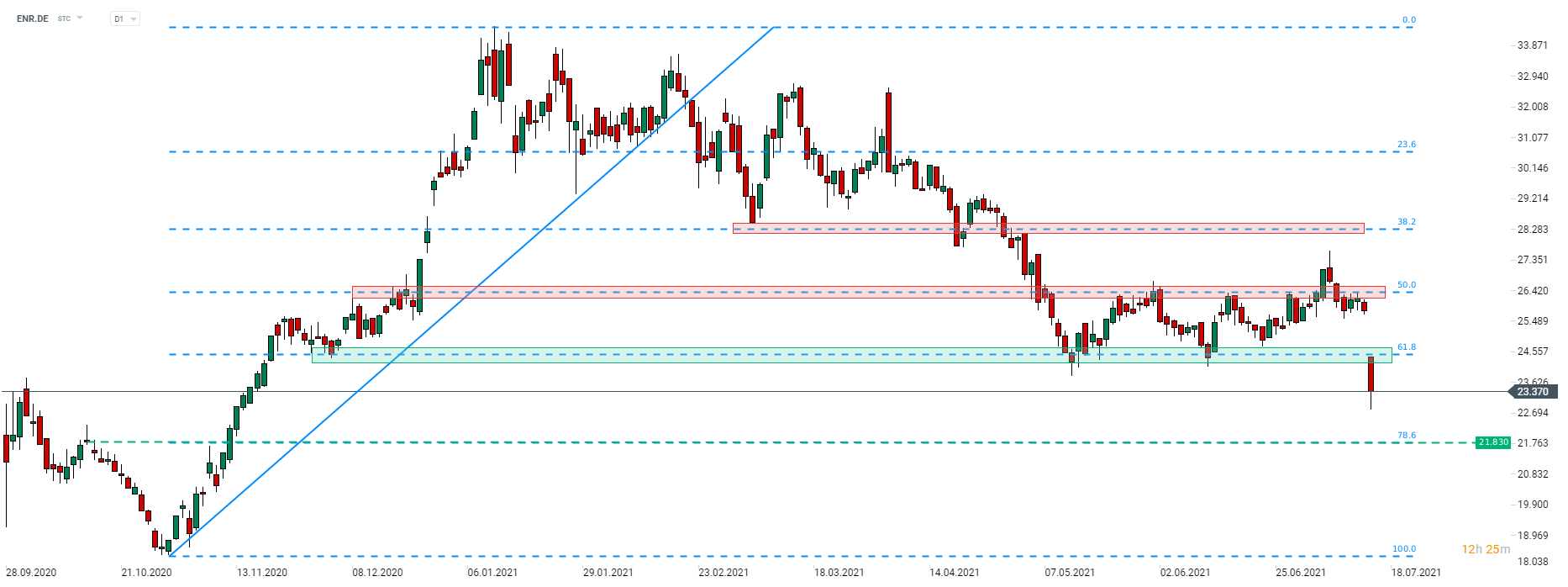 Siemens Energy (ENR.DE) se dnes obchoduje přibližně ve ztrátě 10 % po zveřejnění profit warningu. Akcie spadla pod spodní limitu posledního obchodního rozpětí mezi úrovně 50 % a 61,8 % Fibo retracementu rostoucího pohybu s počátkem na konci roku 2020. Býkům se podařilo vytlačit cenu akcie z denních minim, ale pokud ji dnešní závěr zastihne pod 61,8 % retracementem, tak obchodníci musí počítat s trvajícím medvědím vlivem. Zdroj: xStation5