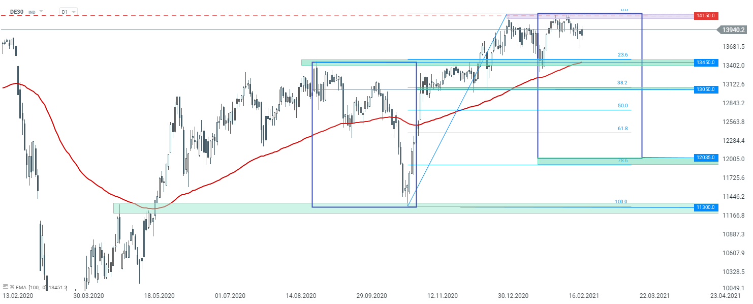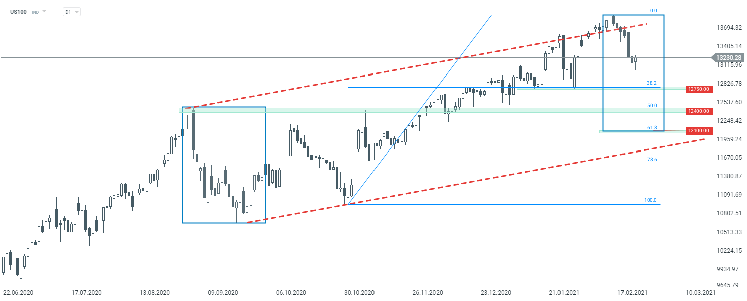 Americký technologický index Nasdaq (US100) tiež zaznamenal počas posledných niekoľkých dní korekciu smerom nadol. Pri pohľade na denný interval vidíme, že výpredaj sa zastavil na prvej kľúčovej podpore vyplývajúcej z 38,2% Fibonacciho retracementu a predchádzajúcich cenových reakcií (12 750 bodov). Korekcia je však v porovnaní s poslednou rastovou vlnou stále malá, takže nemožno vylúčiť ďalšie prehlbovanie poklesu. Ak prevládne aktuálny sentiment, môže korekčný pohyb presahovať do zóny 12 400 bodov alebo dokonca 12 100 bodov, kde je umiestnená spodná hranica štruktúry 1: 1 a 61,8% Fibonacciho retracement.