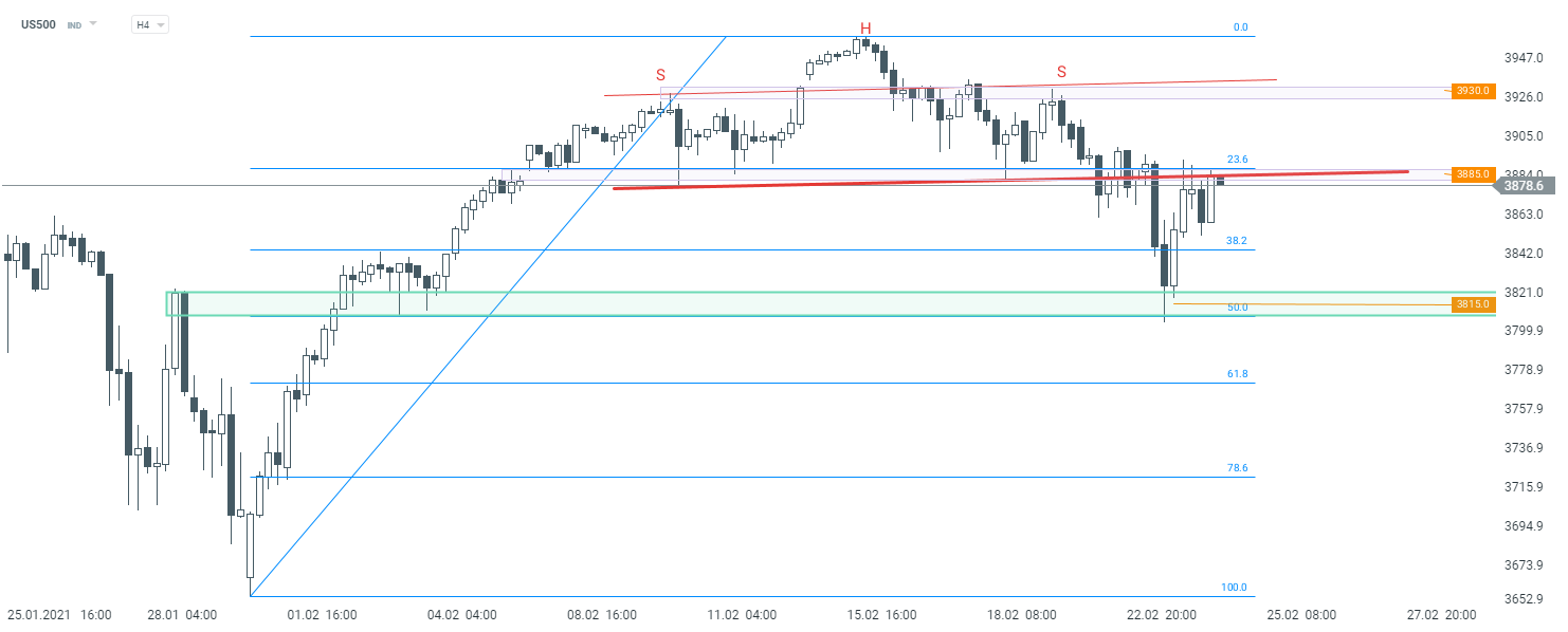 V neposlednom rade sa pozrime na graf US500. Pri pohľade na interval H4 je vidieť, že na grafe sa vytvára formácia hlavy a ramien (ktorá často predznamenáva zvrátenie trendu). Po poklese pod výstrihom vyššie uvedenej formácie začal index prudký pohyb nadol. Nákupcovia znovu získali kontrolu nad podporou na hladine 3 815 bodov. Úroveň 3 885 bodov je zatiaľ kľúčovým odporom, ktorý treba sledovať. Pokiaľ cena leží pod spomínanou hladinou, základným scenárom je ďalší pohyb smerom nadol.