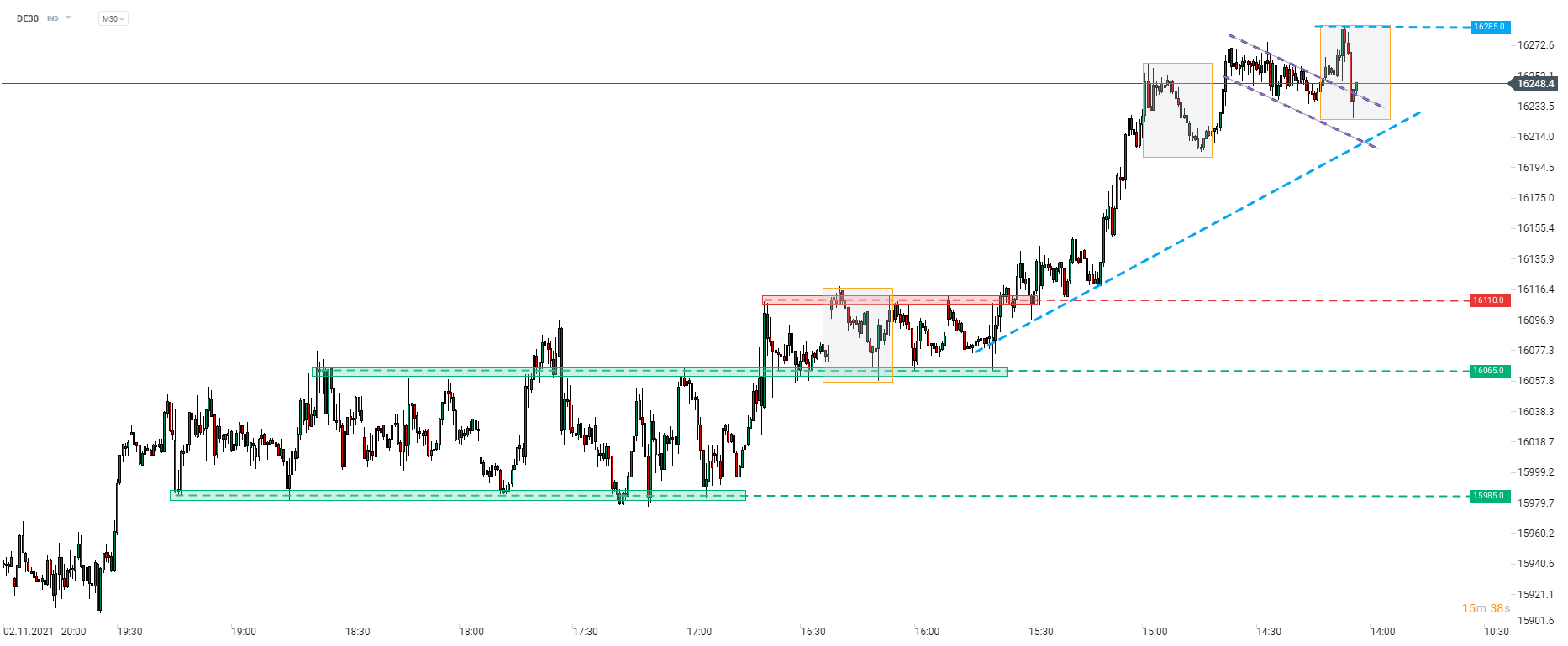DE30 dosiahol na začiatku dnešného obchodovania v Európe čerstvé historické maximum blízko úrovne 16 285 bodov. Index však rýchlo začal vymazávať zisky a vrátil sa späť do rozsahu predchádzajúceho klesajúceho kanála. Pokles sa zastavil na spodnej hranici geometrie miestneho trhu a index sa vyšplhal späť na hornú hranicu kanála. Pozitívna reakcia na spodnú hranicu geometrie trhu naznačuje, že ďalší vzostupný impulz môže byť vygenerovaný už teraz a nové historické maximá sú vzdialené len 0,25 %.
