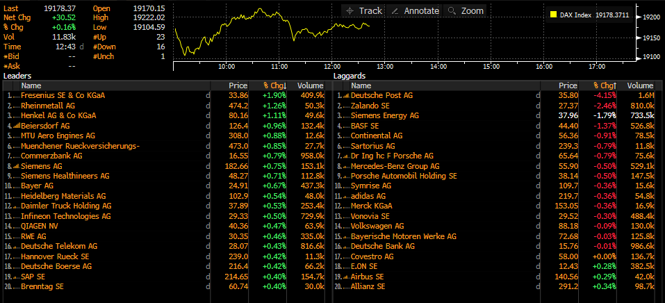 Nejhůře si vedou společnosti v indexu DAX, které ztrácejí kvůli horším než očekávaným finančním výsledkům. Zdroj: Bloomberg Finance L.P.