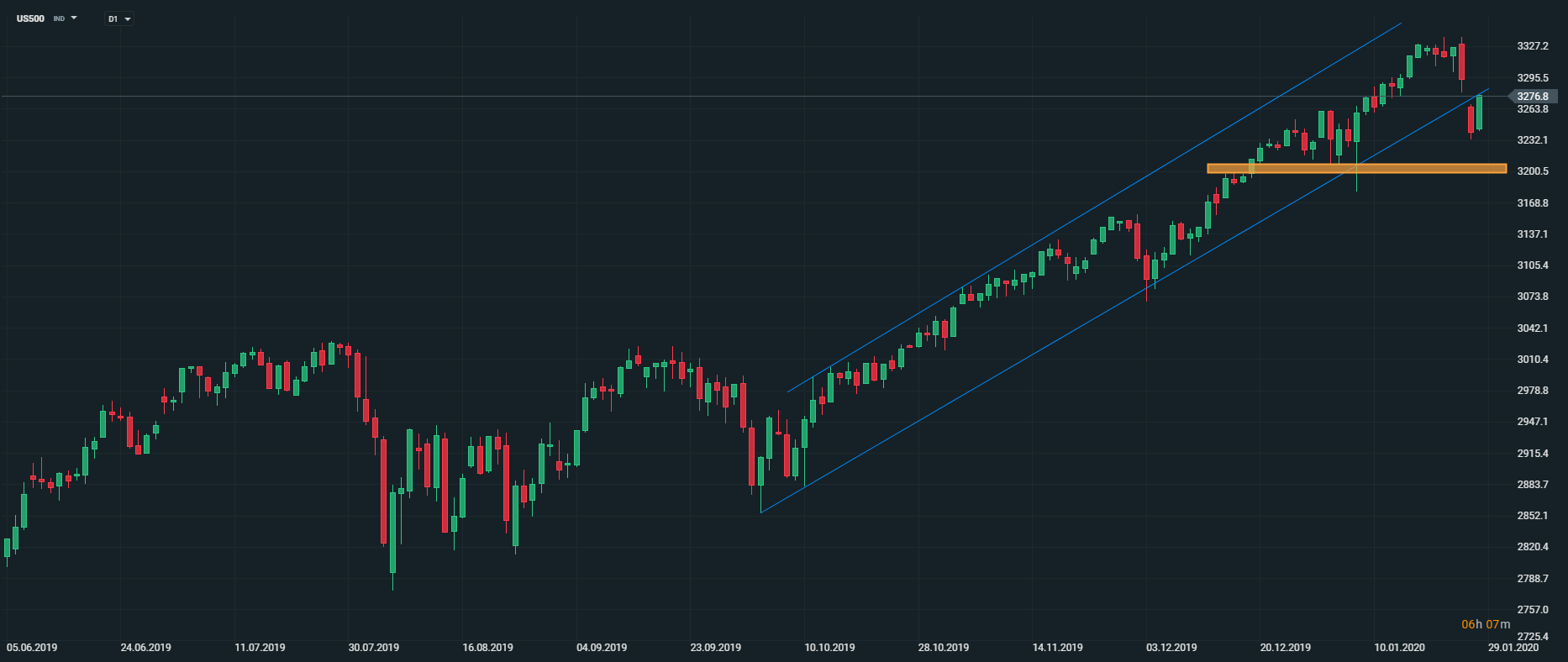 Americký akciový index US500 dnes vymazal skoro celý včerajší pokles. Netreba však zabúdať na to, že v prípade, ak budú prichádzať negatívne správy ohľadom šírenia koronavírusu, môže dôjsť k ďalším poklesom. Akciový index sa pokúša dospať späť do rastového trendového kanála. Zdroj: xStation5