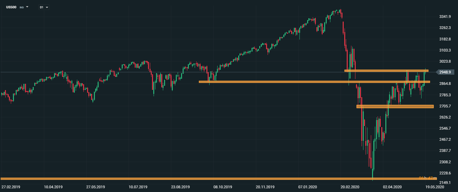 Pozitívna nálada na trhoch mierne oslabuje po tom, čo včera zaznamenal akciový index US500 najvýraznejší nárast za posledných šesť týždňov. Na jednej strane pozitívnu náladu na trhoch podporujú správy od spoločnosti Moderna, ktorá vyhlásila, že ich liek proti koronavírusu vykazuje sľubné výsledky a to, že niektoré európske krajiny pristúpili k uvoľneniu blokovacích opatrení. Na druhej strane však riziko zhoršenia obchodných vzťahov medzi USA a Čínou, ako aj náznaky rôznych autorít a inštitúcií o tom, že hospodárske oživenie bude trvať dlhšie, vytvárajú negatívny tlak na trhy.
