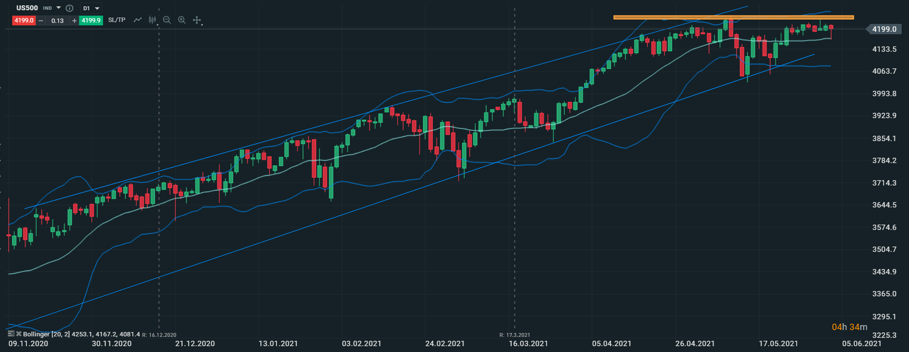 Americké akciový index US500 v súčasnosti testuje psychologickú hranicu na úrovni 4200 bodov. V prípade, ak dokáže denná sviečka uzavrieť nad vyššie uvedenou hladinou, otvorí sa priestor pre dodatočný rast k historickým maximám, ktoré sa nachádzajú okolo hladiny 4230 bodov. Zdroj: xStation5