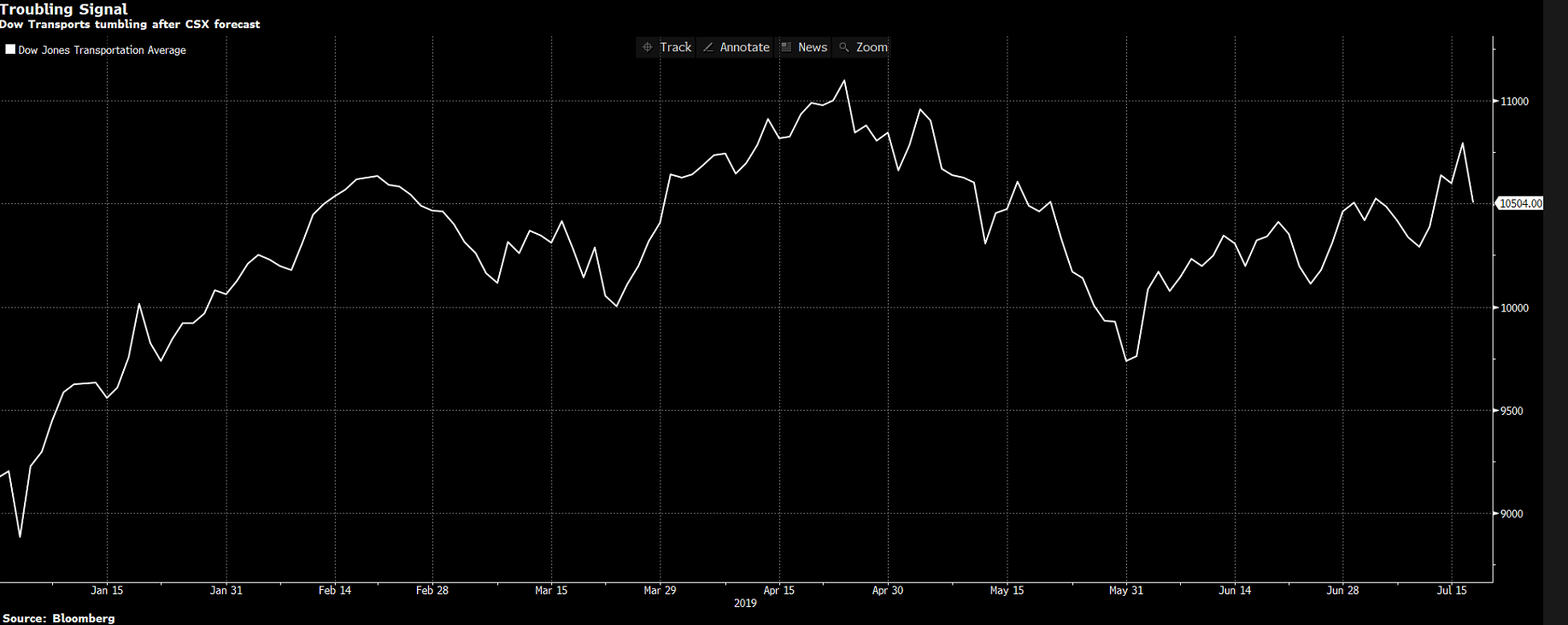 - Spoločnosť CSX (významná americká prepravná spoločnosť) zaznamenala pokles tržieb, pričom znížila aj výhľad pre rok 2019. Akcie spoločnosti CSX klesli v reakcii na zverejnenie hospodárskych výsledkov o približne 11%
