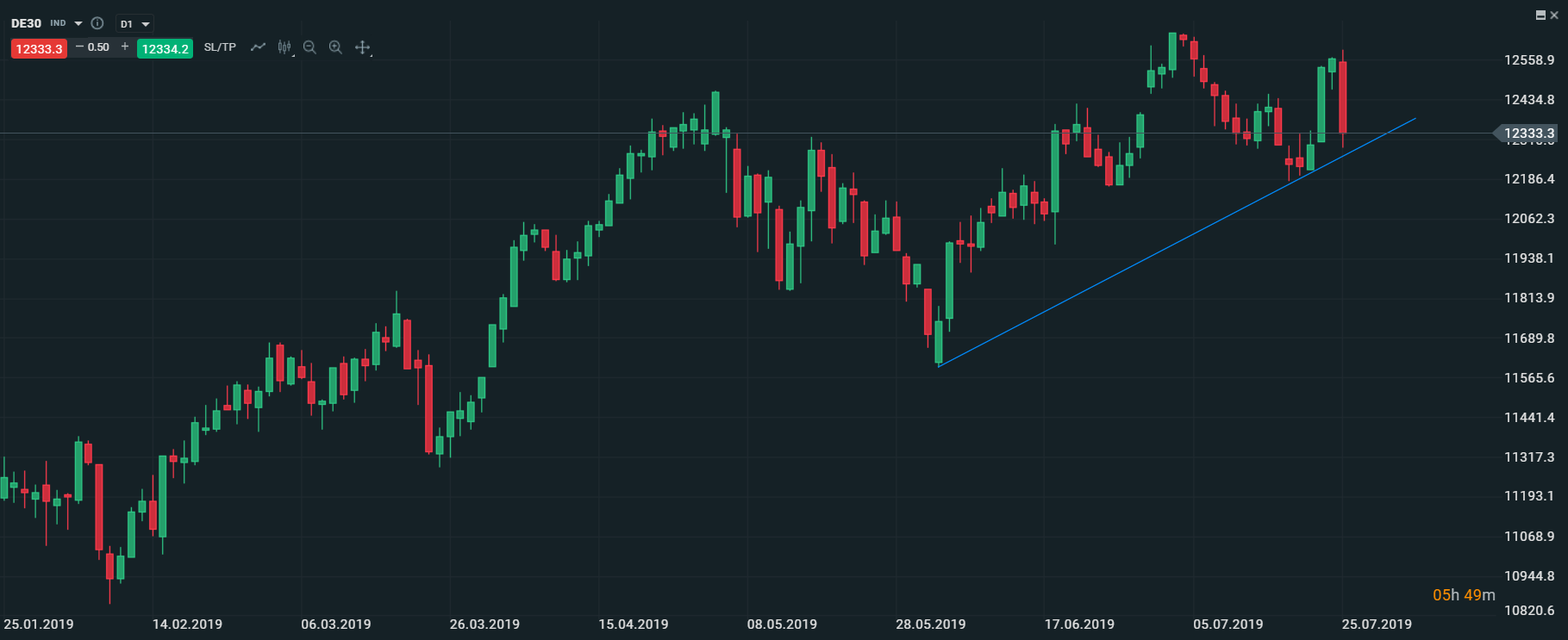 Nemecký index DAX zaznamenal po zasadaní prudký pokles k rastovej trendovej čiare. V prípade, ak sa index obchoduje nad hranicou 12 300 bodov, výhľad ostáva rastový. Zdroj: xStation5
