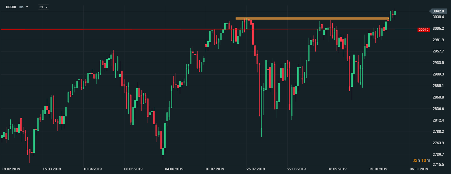 Americký akciový index US500 sa obchoduje v blízkosti historických maxím. V prípade, ak denná sviečka dokáže uzavrieť nad úrovňou 3050 bodov, otvorí sa priestor pre rast k psychologickej hranici 3100 bodov. Zdroj: xStation5