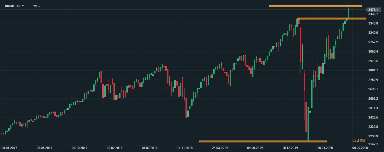 Americký akciový index US500 sa približuje k hladine 3500 USD. V prípade, ak bude pozitívna nálada aj naďalej pretrvávať, otvorí sa priestor na dodatočný rast a na prekonanie spomínanej úrovne. Zdroj: xStation5