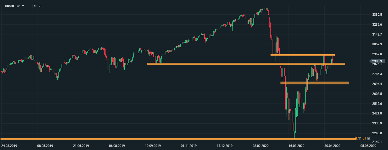 Optimizmus sa dnes vytratil z trhov, nakoľko si investori začínajú uvedomovať, že aj keď v obmedzenej miere, ale blokovacie opatrenia môžu trvať dlhší čas ako sa pôvodne očakávalo, a teda hospodárske oživenie v tvare V môže byť ohrozené. Americká banka Goldman Sachs očakáva, že v priebehu nasledujúcich troch mesiacov sa na trhy vráti vlna pesimizmu, pričom americký akciový index S & P 500 (US500) zaznamená pokles o približne 20% a dostane sa k úrovni 2400 bodov. Ku koncu roka banka očakáva, že akciový index sa vráti naspäť k úrovni 3000 bodov.