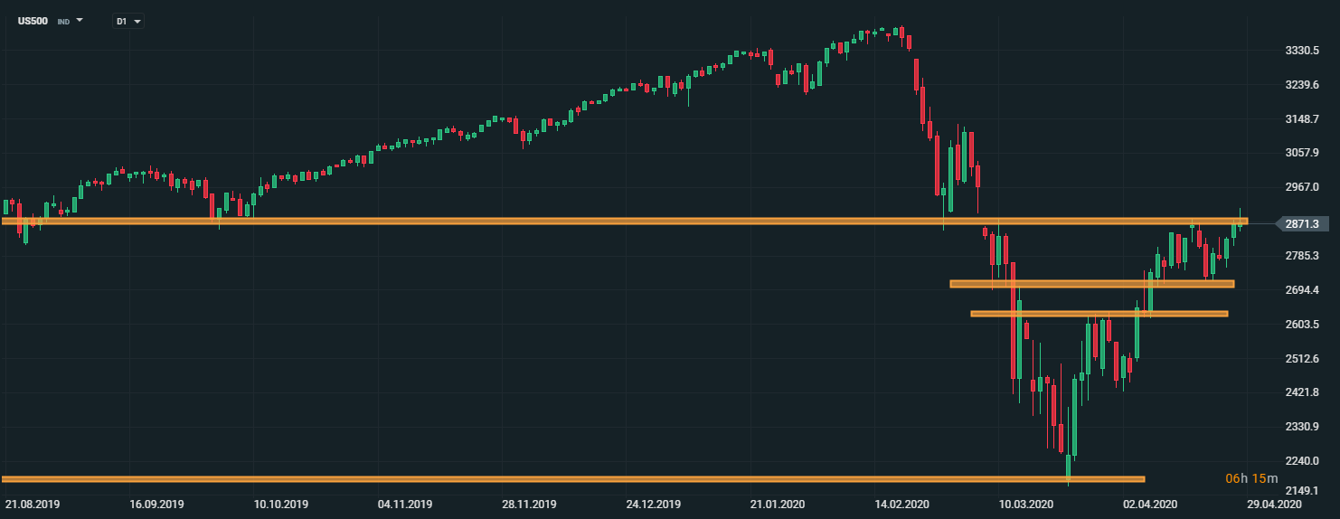 Americký akciový index US500 dnes testoval rezistenciu na úrovni 2900 bodov. V prípade pokračovania pozitívnej nálady na trhoch, môže index opätovne testovať spomínanú rezistenciu. V prípade, ak by index prekonal vyššie uvedenú úroveň, otvorí sa priestor pre rast k úrovni 3000 bodov. Zdroj: xStation5