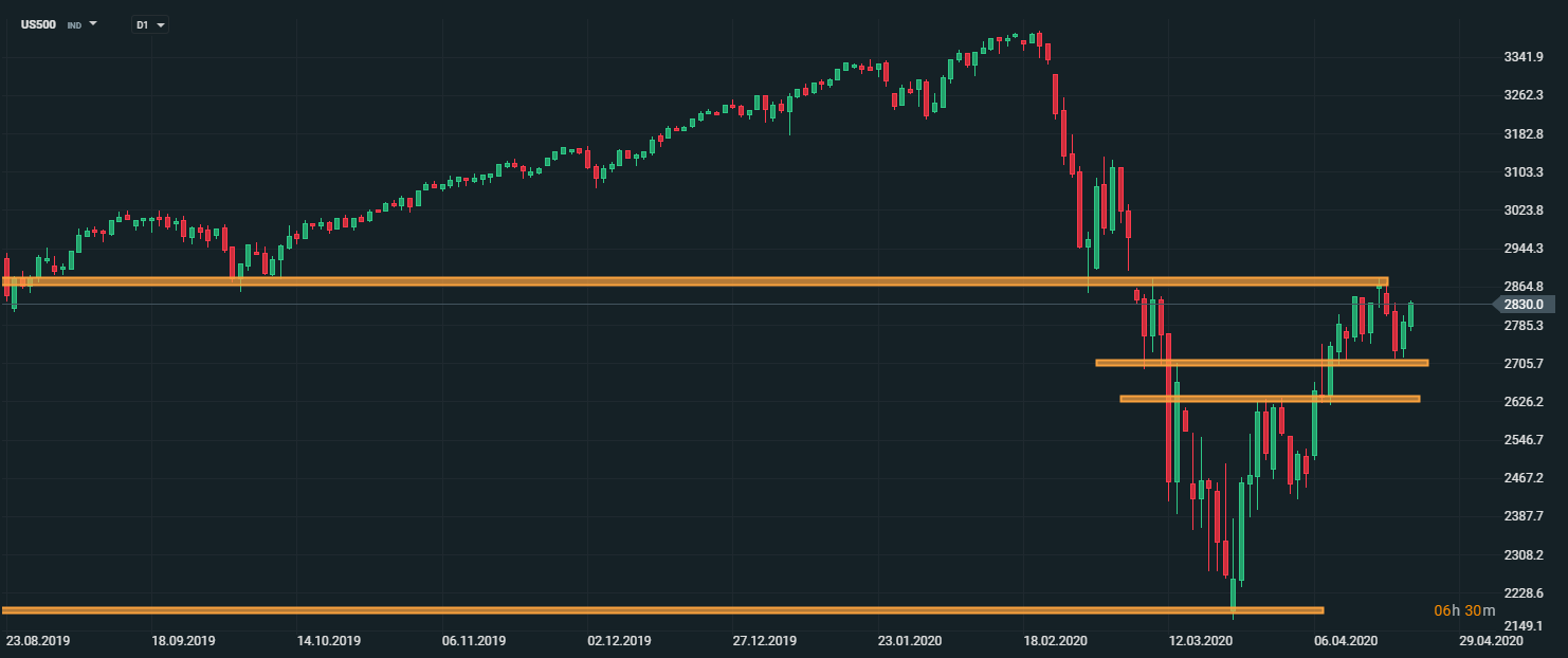 Americký akciový index US500 nedokázal prekonať support na úrovni 2700 bodov a zaznamenal nárast, pričom prekonal úroveň 2800 bodov. Silná úroveň rezistencie sa nachádza v oblasti 2900 bodov. V prípade, ak by cena spomínanú úroveň prekonala, otvorí sa priestor pre rast k úrovni 3000 bodov. V opačnom prípade, ak by cena prekonala support na úrovni 2700 bodov, otvorí sa dodatočný priestor na pokles, ktorý by mohol siahať až k lokálnym minimám okolo úrovne 2200 bodov. Zdroj: xStation5