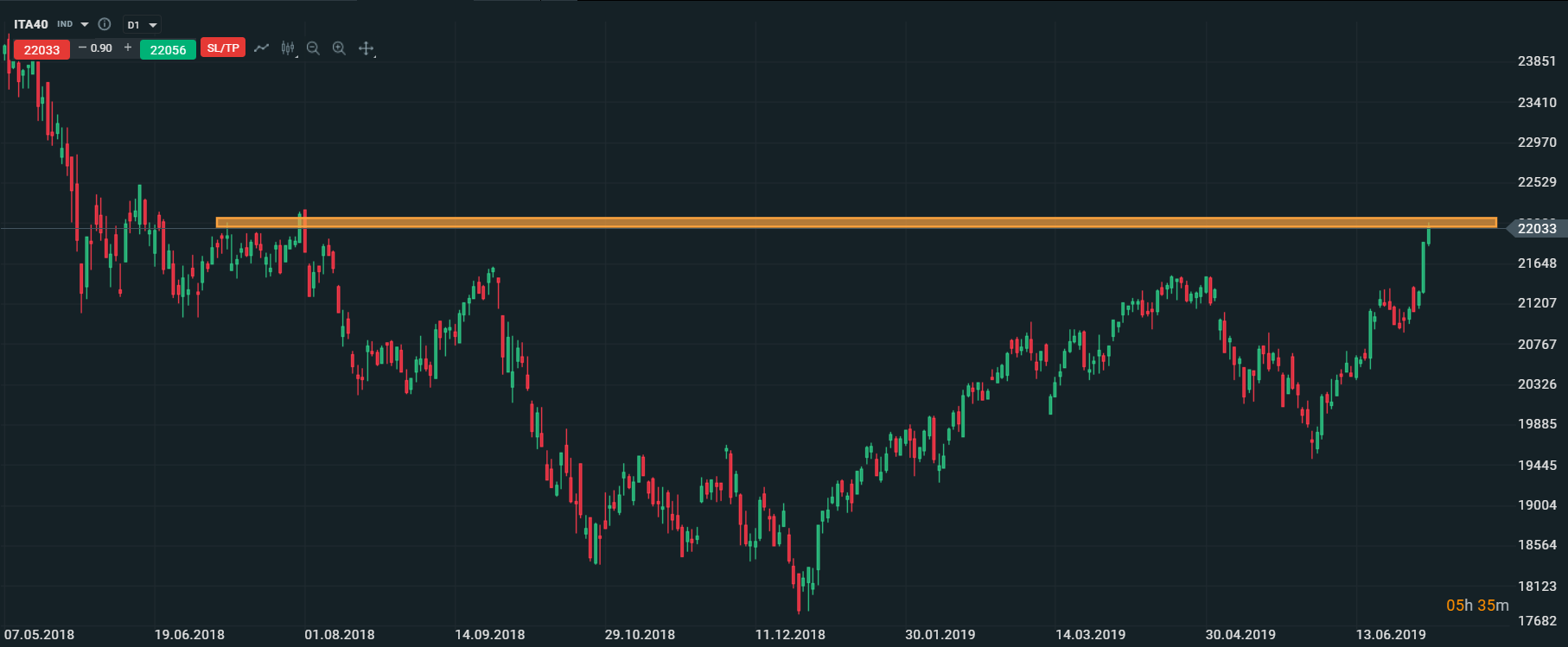 ITA40 testuje úroveň 22 000 bodov. V prípade, ak denná sviečka dokáže uzavrieť nad touto úrovňou, otvorí sa priestor pre potenciálny rast k úrovni 22 800 bodov. Zdroj: xStation5
