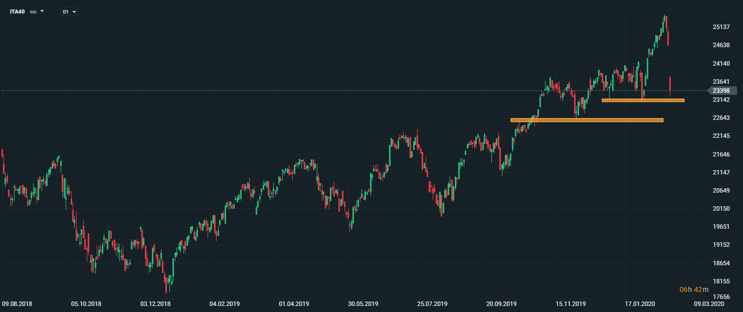 Taliansky akciový index (ITA40) dnes zaznamenal výrazný pokles vďaka novým prípadom koronavírusu v Taliansku. Cena sa približuje k silnému supportu na úrovni 23150 bodov. V prípade, ak by cena prekonala spomínanú úroveň podpory, otvorí sa priestor na pokles k hranici 22600 bodov. Zdroj: xStation5
