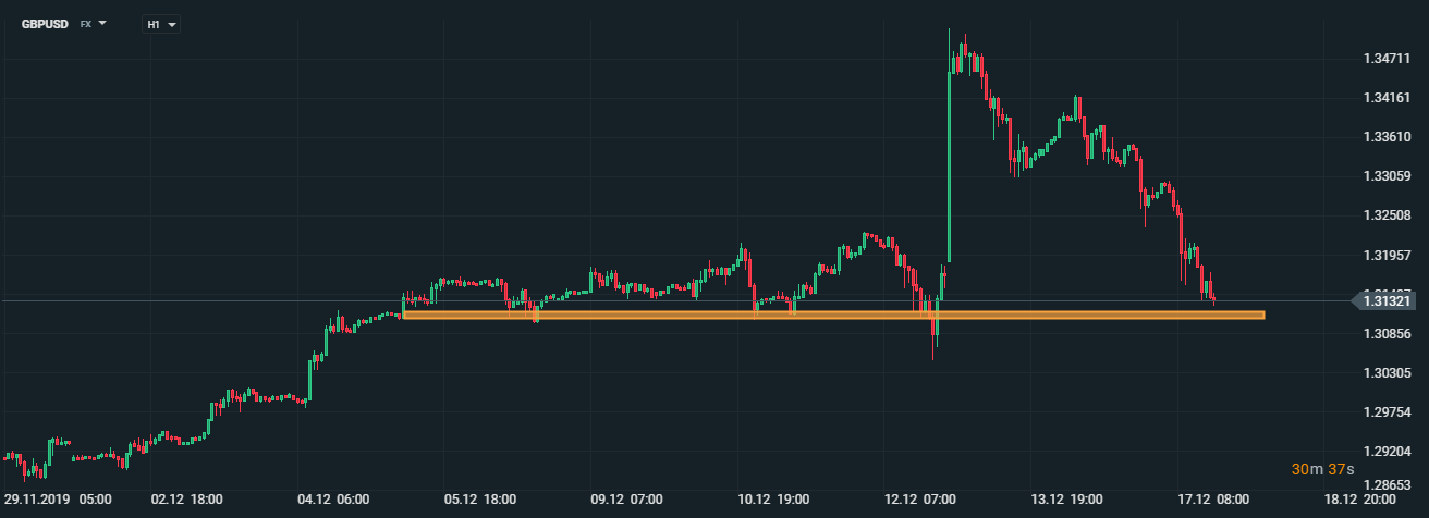Menový pár GBPUSD dnes vymazal všetok rast, ktorý zaznamenal po britských voľbách. Menový pár sa približuje k silnému supportu v oblasti 1,31. V prípade, ak cena nedokáže vyššie uvedenú úroveň supportu prekonať, môže dôjsť ku spätnej korekcii. Treba si ale uvedomiť, že vstup do dlhých pozícii je po tak silnom klesajúcom trende riskantný a bezpečnejšie by mohlo byť počkať na konsolidáciu. Zdroj: xStation5