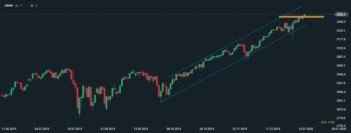 Americký akciový index US500 dnes prekonal hranicu 3300 bodov. V prípade, ak dokáže uzatvoriť týždenná sviečka nad spomínanou úrovňou, otvorí sa priestor pre dodatočný rast k vrchnej časti rastového kanála. Zdroj: xStation5