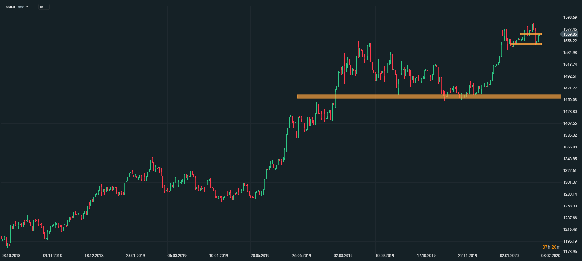 Cena zlata dnes testuje rezistenciu na úrovni 1570 USD. V prípade, ak dokáže týždenná sviečka uzavrieť pod spomínanou úrovňou, klesajúci trend ostáva v platnosti. Smerodajné bude ale to, aká nálada bude na trhoch panovať počas budúceho týždňa. Zdroj: xStation5