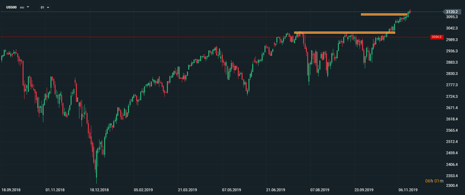 Americký akciový index US500 sa obchoduje v blízkosti historicky najvyšších úrovní. Pokiaľ cena ostáva nad psychologickou hranicou 3100 bodov, rastový trend ostáva v platnosti. Zdroj: xStation