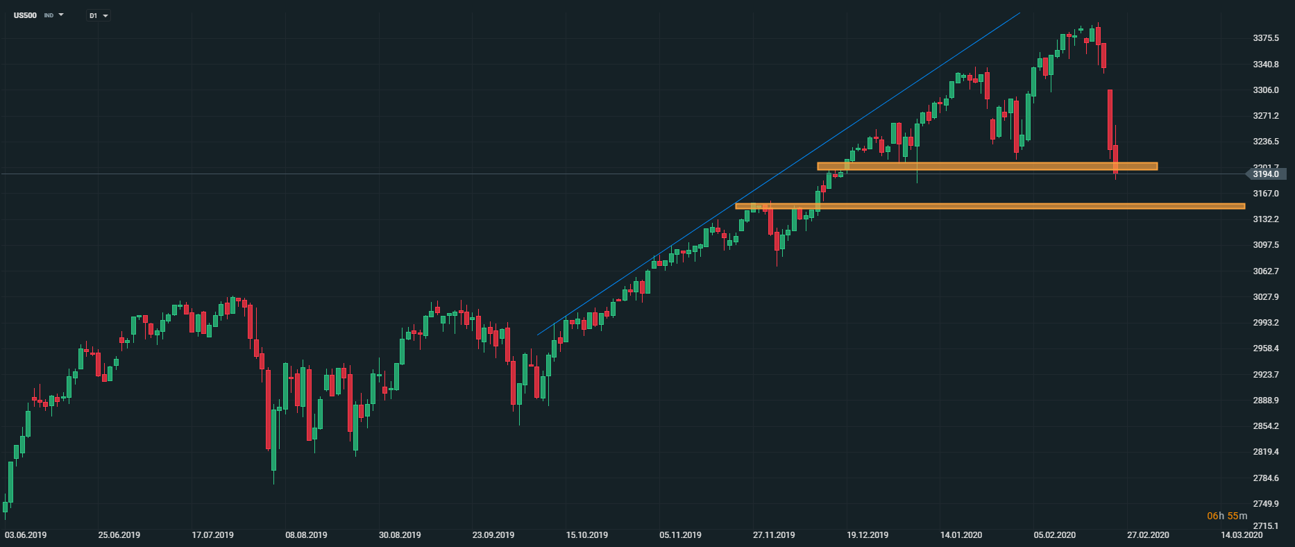 Americký akciový index US500 dnes prekonal kľúčový support na úrovni 3200 bodov a má namierené k ďalšiemu supportu na úrovni 3150 bodov. Zdroj: xStation5