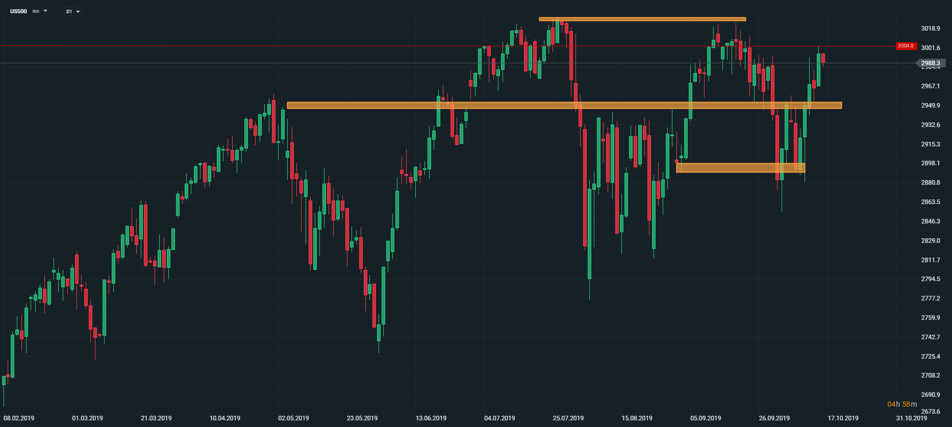 Americký akciový index US500 sa včera odrazil od psychologickej hranice 3000 bodov. Dnešný pohyb smerom nadol vnímame ako korekciu. V prípade pozitívnych správ ohľadom obchodných rokovaní, index môže prekonať vyššie spomínanú psychologickú úroveň a atakovať historické maximá. Zdroj: xStation5