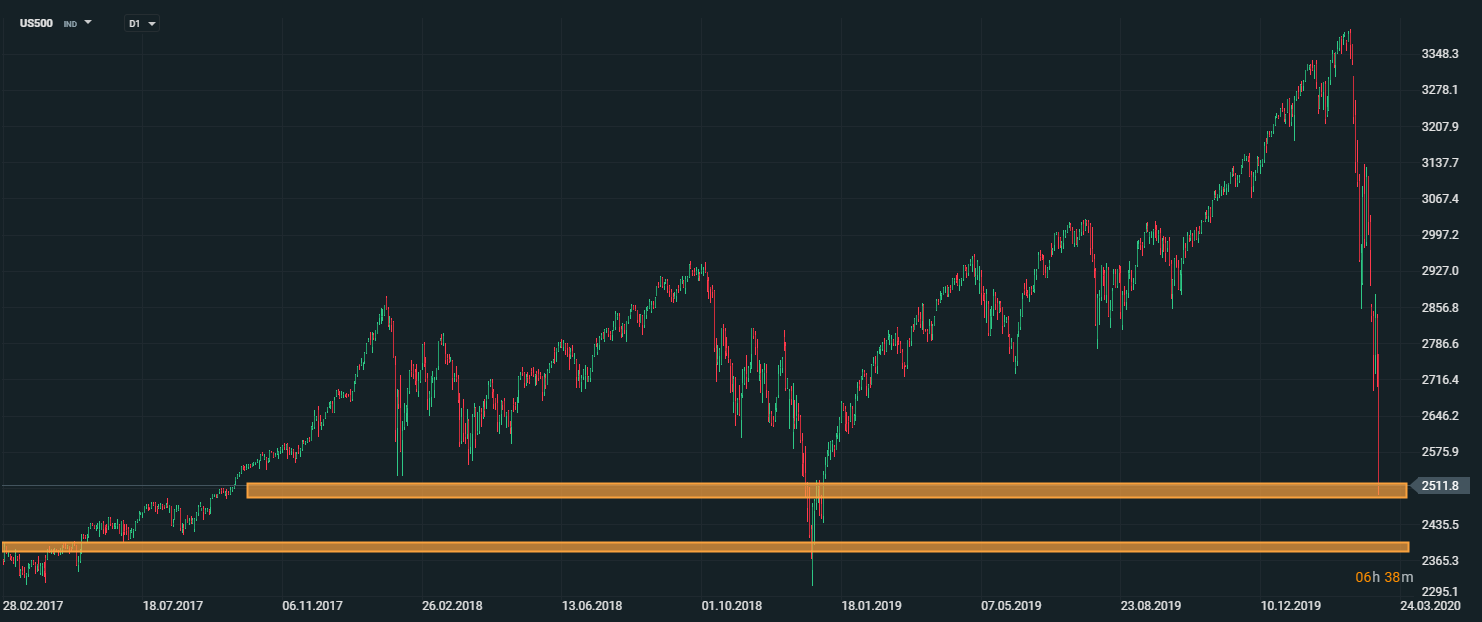 Americký akciový index US500 dnes zaznamenal výrazný pokles a v súčasnosti testuje psychologickú hranicu 2500 bodov. V prípade, ak bude negatívna nálada na trhoch pokračovať, ďalšia úroveň supportu sa nachádza v oblasti 2400 bodov. Zdroj: xStation5
