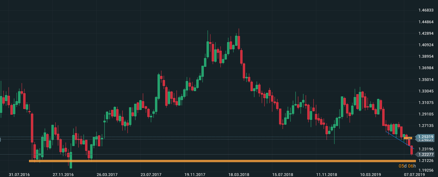 Menový pár GBPUSD testuje najnižšie úrovne od roku 2017. Prípadný pokračujúci pokles by sa mohol rozšíriť až ku kľúčovej úrovne 1,2000. Zdroj: xStation5