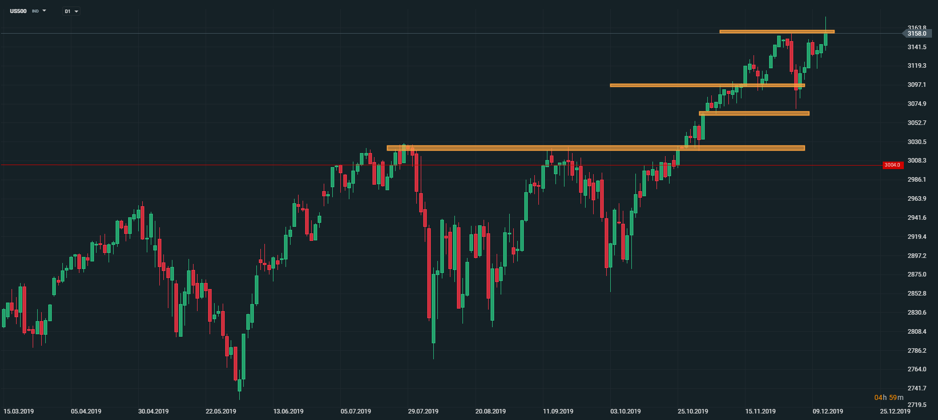 Americký akciový index US500 sa dnes dostal na historicky najvyššie úrovne, no časť ziskov neskôr vymazal. Index v súčasnosti testuje rezistenciu na úrovni 3160 bodov. V prípade, ak dokáže denná sviečka uzavrieť nad vyššie spomínanou úrovňou, otvorí sa priestor pre dodatočný rast k úrovni 3200 bodov. Treba mať na pamäti, že ďalší vývoj bude do značnej miery ovplyvňovať to, či vstúpia do platnosti dodatočné clá na dovoz tovarov z Číny do USA. Zdroj: xStation5