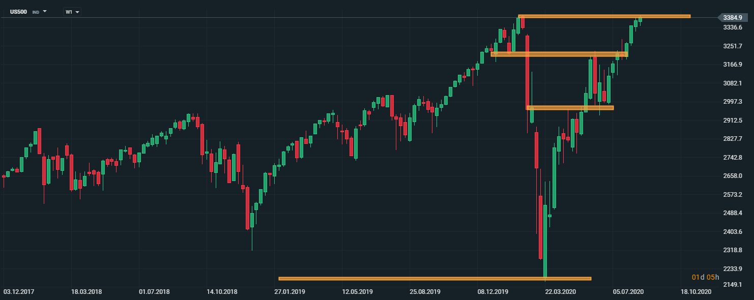 Americký akciový index US500 sa obchoduje pod kľúčovou úrovňou rezistencie 3400 bodov. V prípade, ak by sa počas budúceho týždňa objavil pozitívny sentiment na trhoch, index by mohol spomínanú úroveň prekonať, čím by sa otvoril priestor k psychologickej hranici 3500 bodov. Zdroj: xStation5