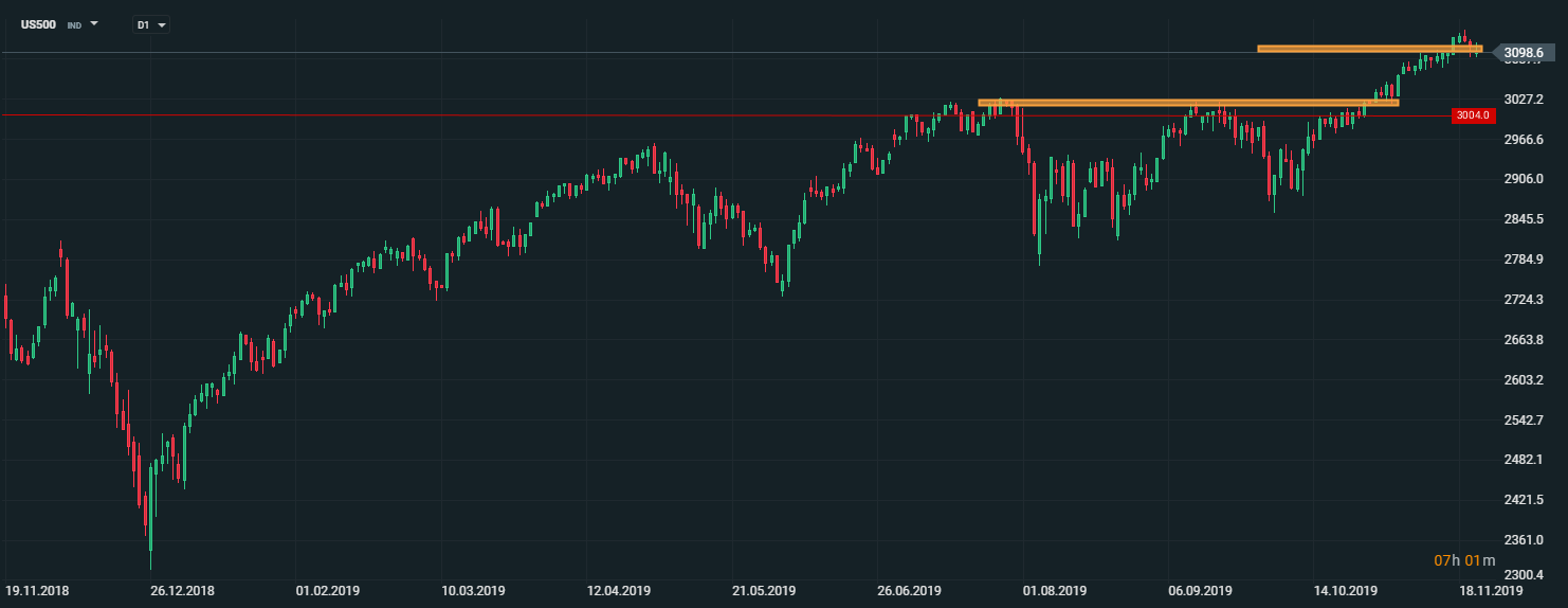 Akciový index US500 testuje kľúčovú hranicu 3100 bodov. V prípade negatívnych správ je možné, že index zaznamená hlbšiu korekciu. Dlhodobý trend je však rastový a prípadná korekcia môže vytvoriť vhodnú príležitosť na nákup. Treba mať na pamäti, že ďalšie smerovanie akciových trhov bude významne závisieť od priebehu obchodných rokovaní (a správ) medzi USA a Čínou. Zdroj: xStation