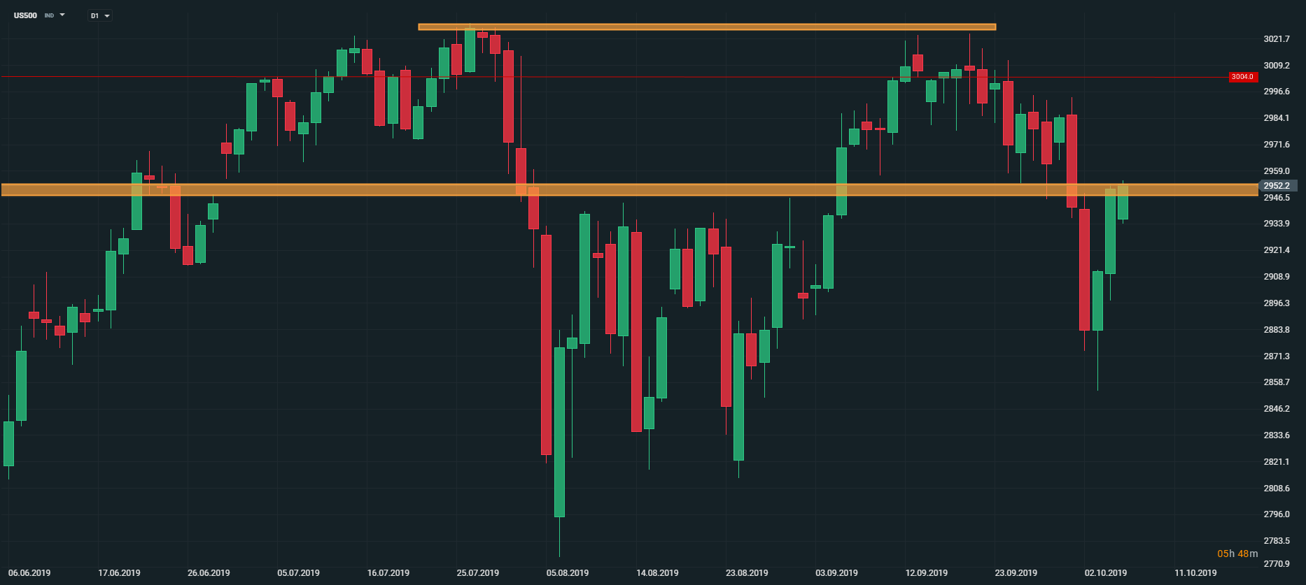 Americký akciový index US500 testuje úroveň 2950 bodov. V prípade, ak dokáže uzatvoriť denná sviečka nad spomínanou úrovňou, otvorí sa priestor pre rast k úrovni 3000 bodov. Treba mať však na pamäti, že investori tento týždeň sledujú najmä vývoj obchodných vzťahov medzi USA a Čínou, a preto sa dá očakávať, že práve to bude určovať ďalší smer na akciových trhoch. Zdroj: xStation5