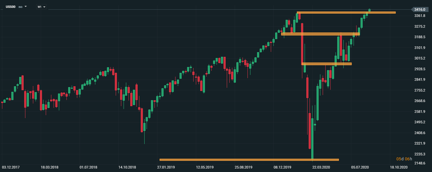Americký akciový index US500 sa na základe pozitívnej nálady na trhoch dokázal dostať nad hladinu 3400 USD. V prípade, ak bude pozitívna nálada aj naďalej pretrvávať, otvorí sa priestor na dodatočný rast k hladine 3500 USD. Zdroj: xStation5