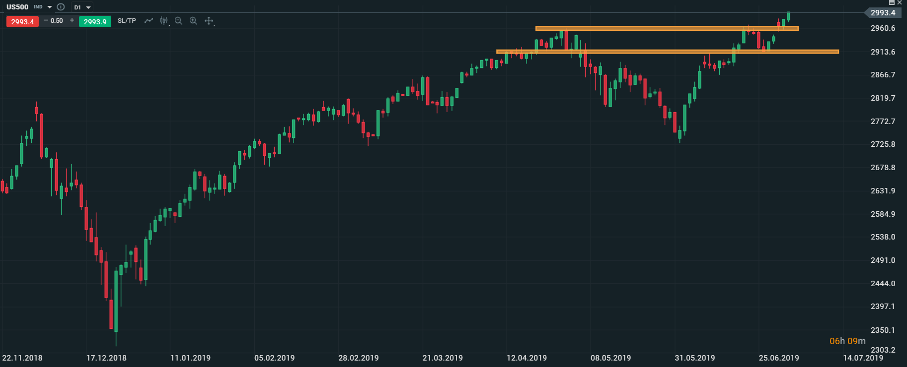 Americký akciový index US500 sa dostáva ku kľúčovej rezistencii na úrovni 3000 bodov. Zdroj: xStation5