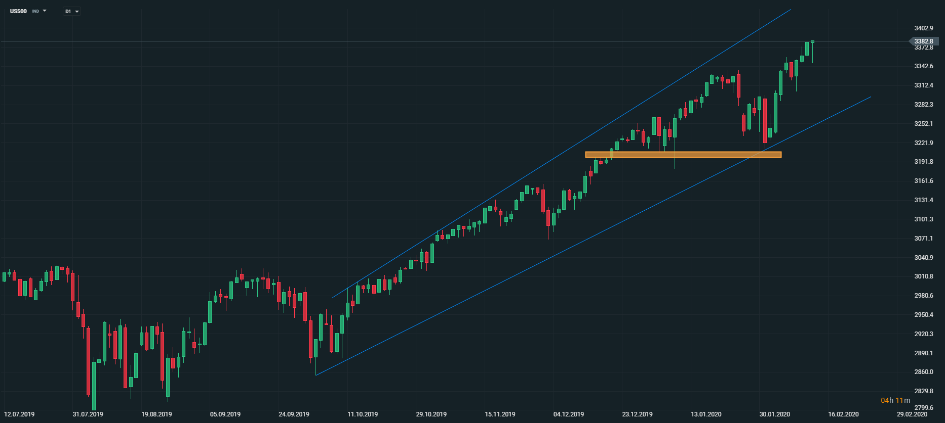 Americký akciový index US500 dokázal vymazať straty z prvej polovice dňa a v súčasnosti atakuje nové historické maximá. Ako sme si mohli všimnúť aj dnes, trhy sú stále citlivé na správy ohľadom koronavírusu, preto je rastová rally na indexe v súčasnosti pomerne krehká. Každá negatívna správa ohľadom šíriacej sa nákazy môže spôsobiť výpredaj na trhoch. Zdroj: xStation5