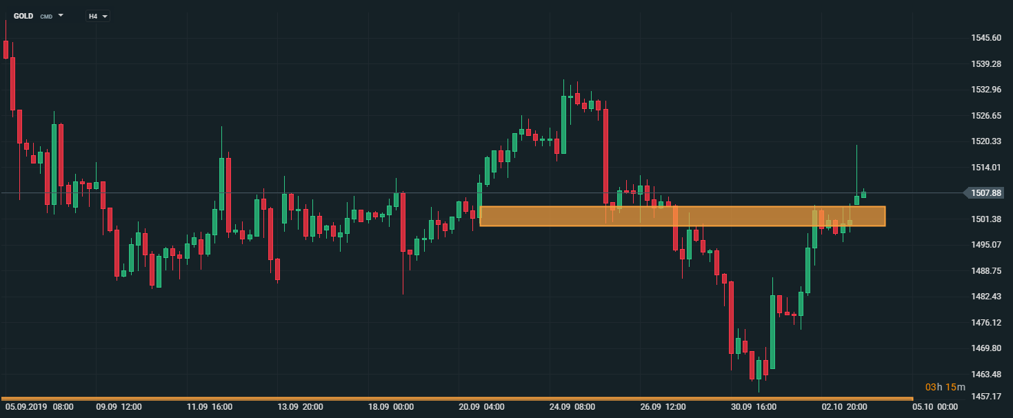 Cena zlata kvôli nedávnej vlne negatívnych dát z USA, ktorá podporila obavy ohľadom budúceho stavu US ekonomiky, prekonala úroveň 1500 USD. V prípade, ak denná sviečka dokáže uzavrieť nad úrovňou 1500 USD, otvorí sa priestor pre rast k úrovni 1530 USD. Zdroj: xStation5