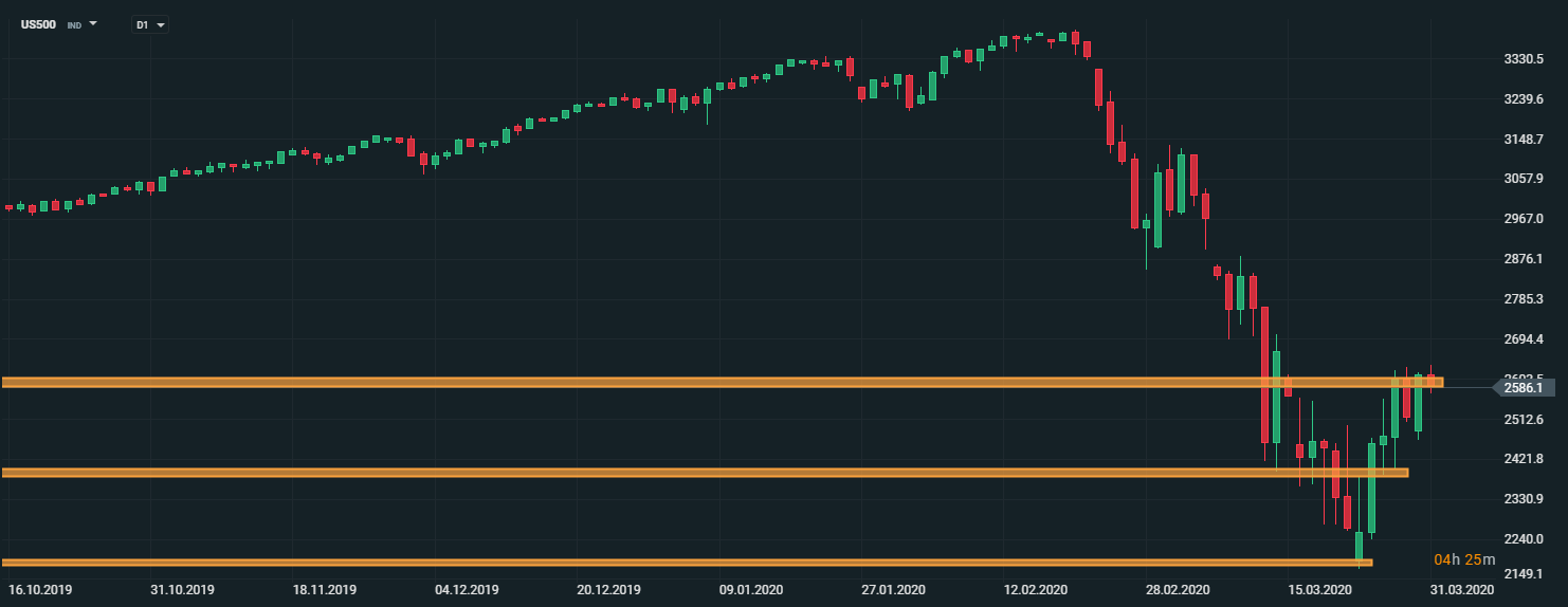 Americký akciový index US500 sa dnes odrazil od psychologickej hranice 2600 bodov. V prípade negatívnej nálady na trhoch nie je vylúčený pokles k lokálnym minimám okolo úrovne 2200 bodov. Zdroj: xStation5