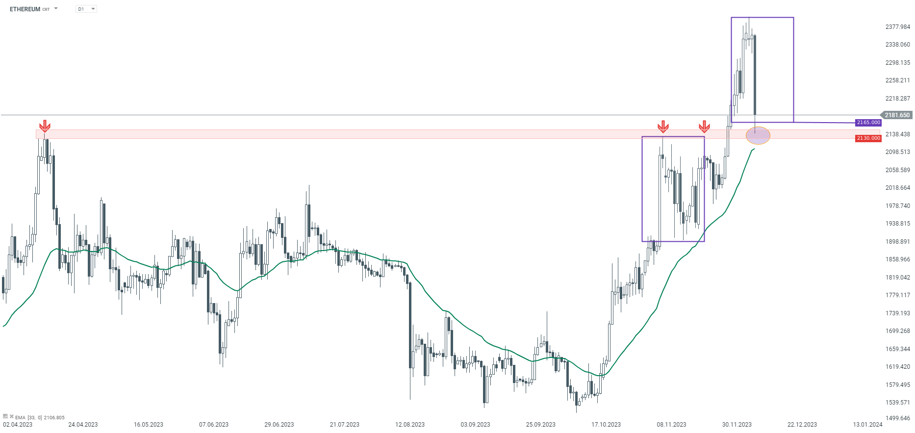 Ceny etherea mírně překonaly geometrii 1:1, ale v současné době testují klíčovou podporu na úrovni 2130 USD. Pokud se tuto úroveň podaří ubránit, může dojít k obnovení vzestupného pohybu, v opačném případě by mohla nastat větší korekce. Zdroj: xStation5