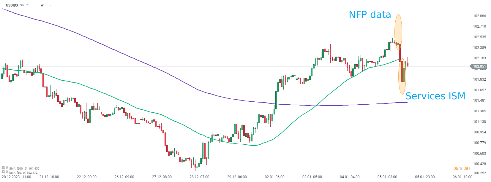 USD index (USDIDX) prožil volatilní den, kdy hlavní hybnou silou cenových pohybů byly "jestřábí" NFP a "holubičí" údaje ISM. Zdroj: xStation5