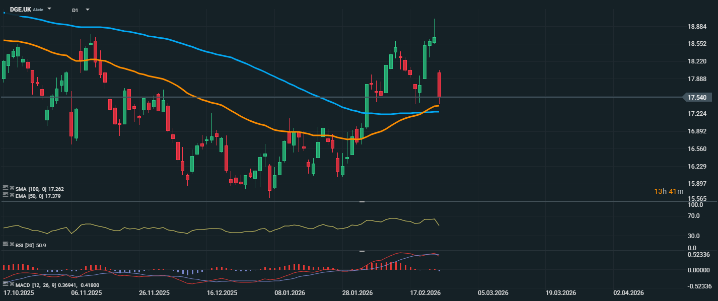 Cena akcií Diageo se prudce propadla a nyní se pohybuje v těsné blízkosti EMA 50 (17,38 GBP) a zároveň mírně nad SMA 100 (17,26 GBP). Tato zóna představuje klíčovou technickou podporu. Její udržení může znamenat pokračování střednědobé stabilizace, zatímco průraz směrem dolů by otevřel prostor k poklesu zpět do pásma 16,80–17,00 GBP. RSI se nachází na hodnotě 50,9, tedy v neutrální oblasti, což signalizuje vyrovnanost mezi kupci a prodejci po předchozím překoupeném stavu.